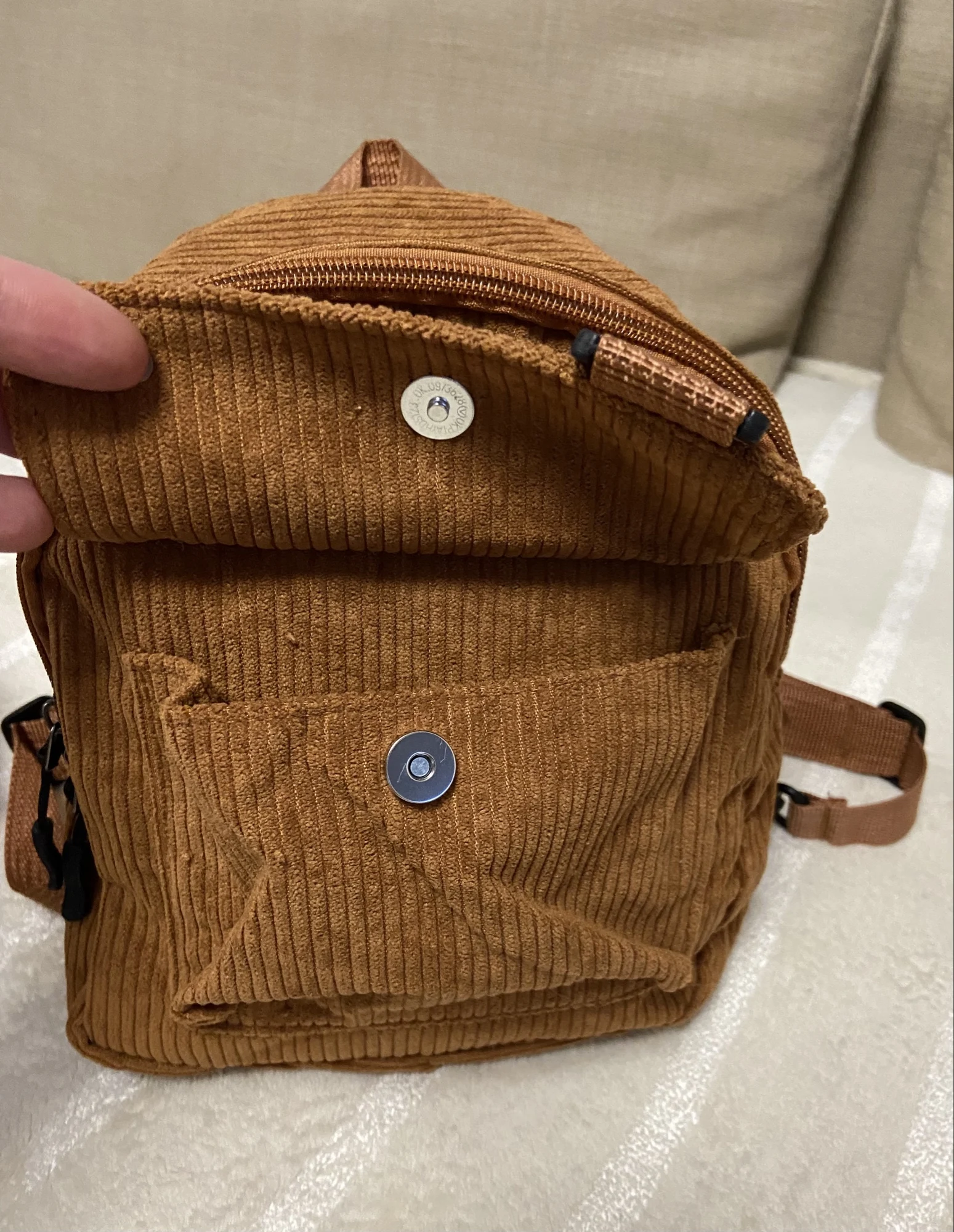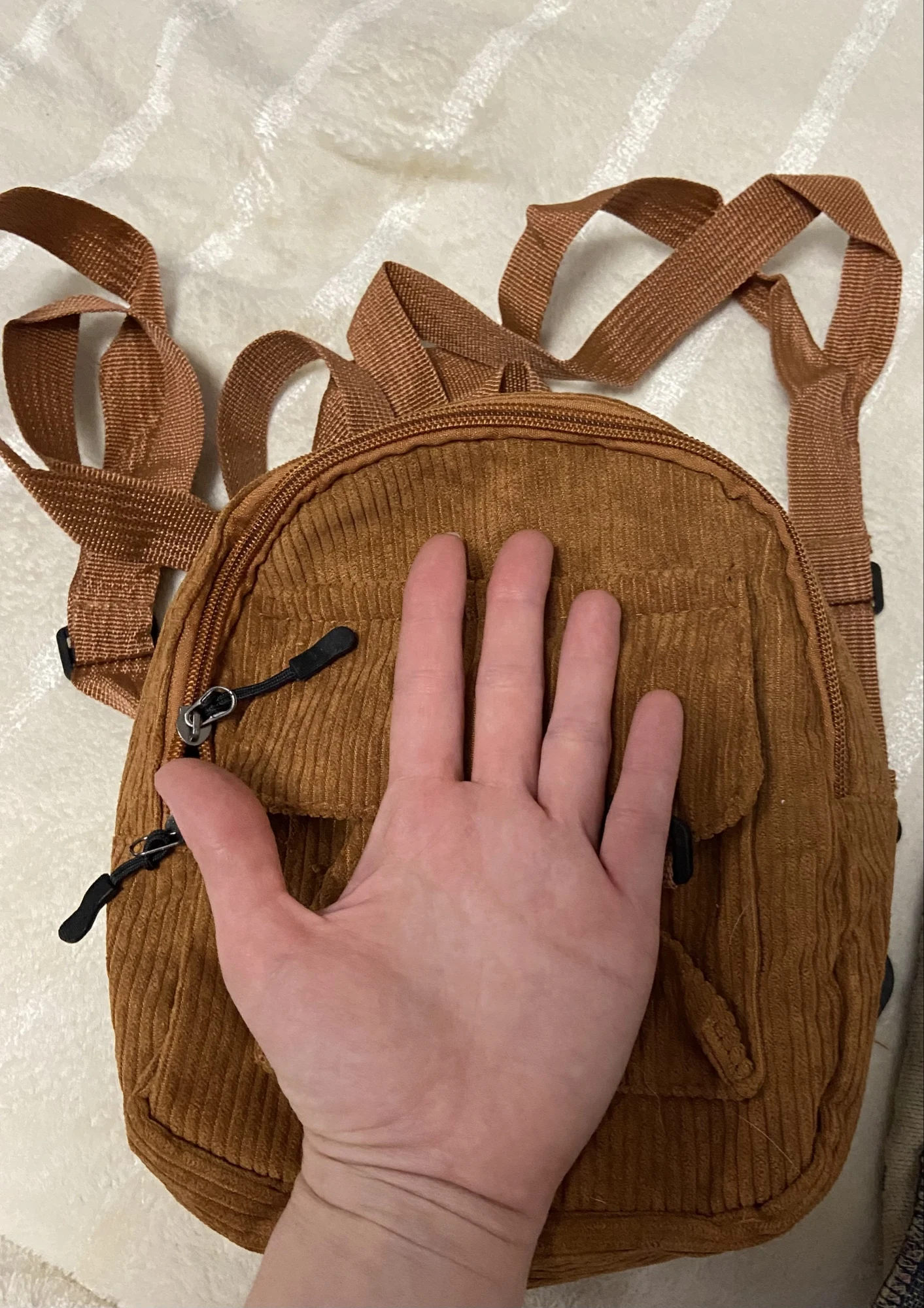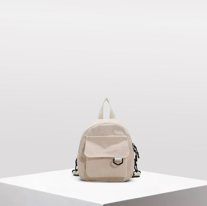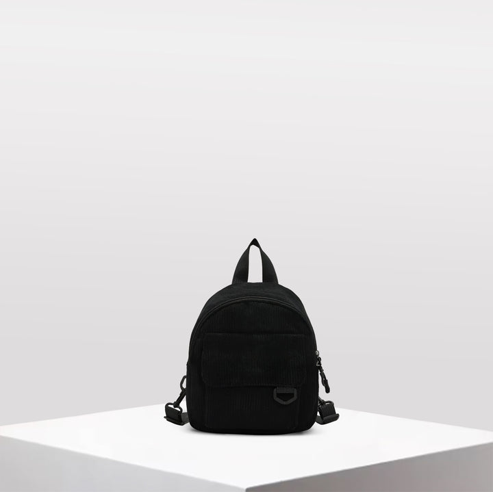 A compact yet stylish backpack crafted from soft corduroy. Slightly larger than hand size, it’s perfect for carrying essentials like a wallet, phone, keys, and a small tablet.